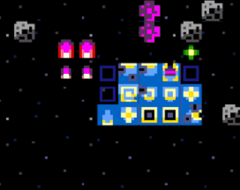 Add green blocks to your ship by moving into them. Blocks can only be added on the blue grid around your ship.